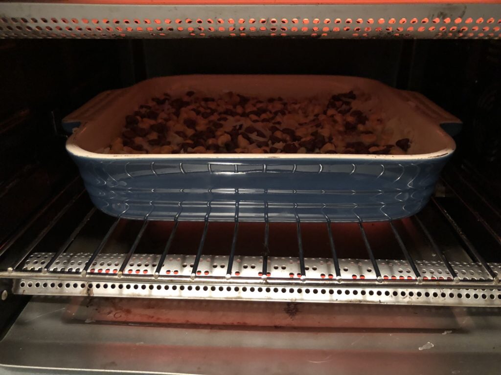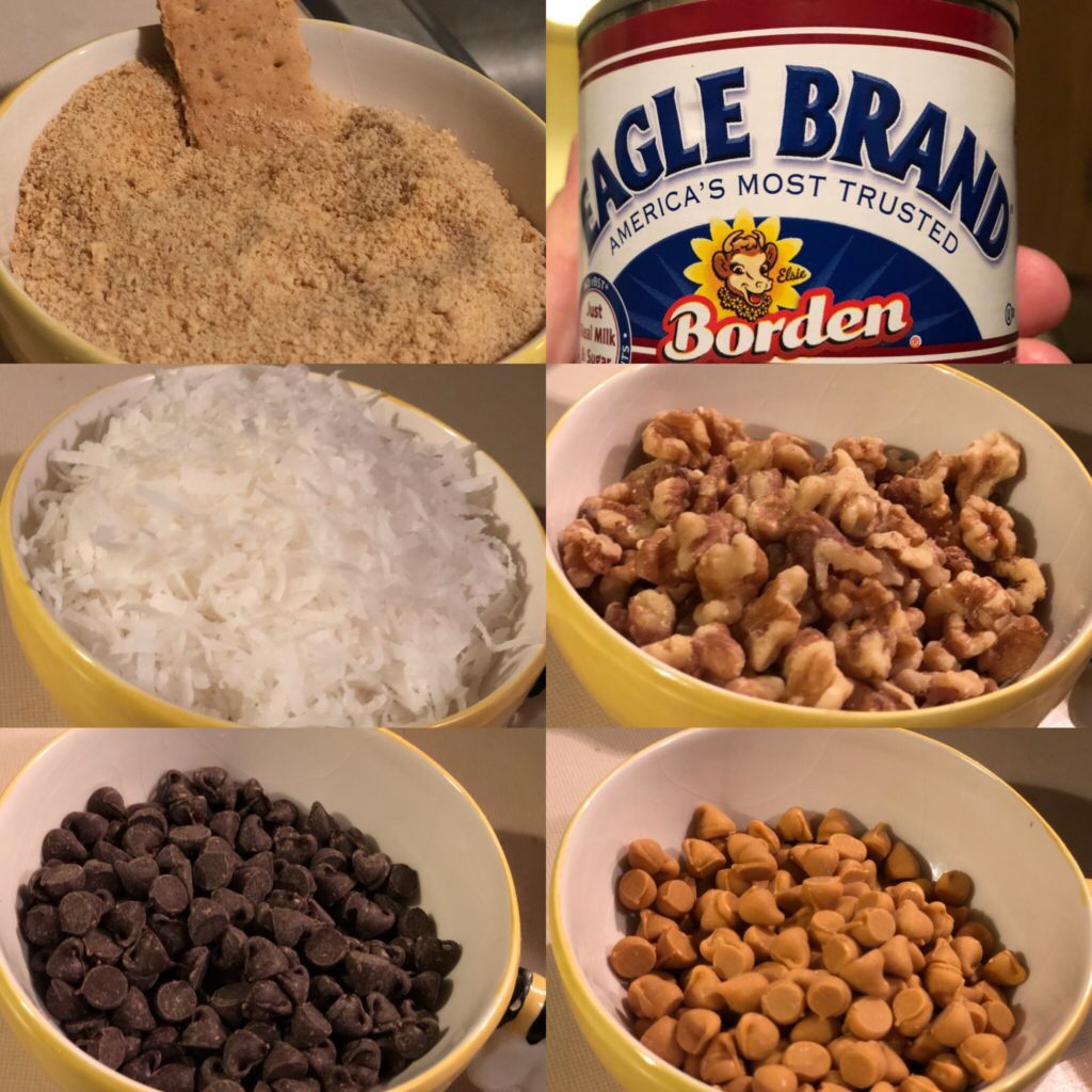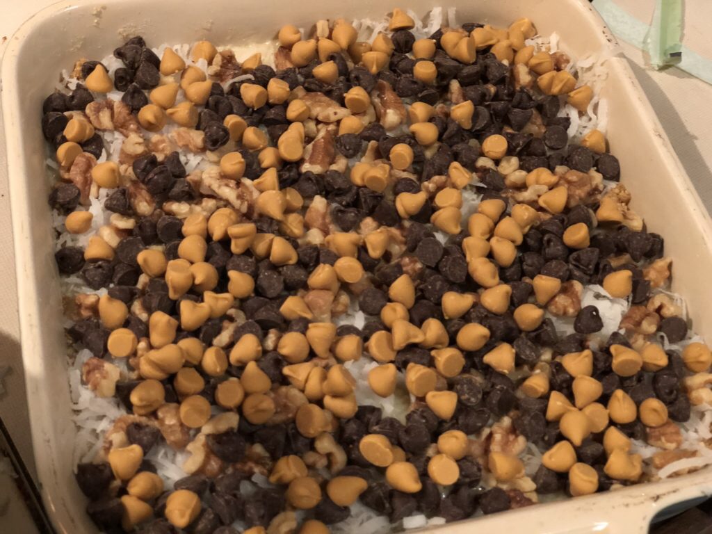 The directions say to layer the ingredients one at a time. Looking back, I think it would be better to mix the coconut, walnut chunks, butterscotch, and chocolate morsels all together. You want to carefully smoosh everything down into the pan. The condensed milk acts like glue to keep everything together.