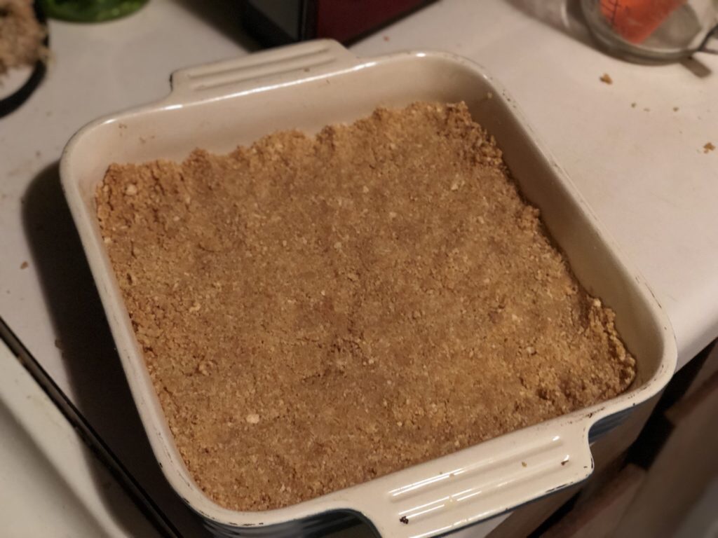 The process is pretty straightforward. It’s almost like a dump cake. You do want to melt the butter and mix with the graham cracker crumbs. Make sure to press them down in the bottom of the pan. If you have made a cheesecake crust, it’s kinda the same thing.
