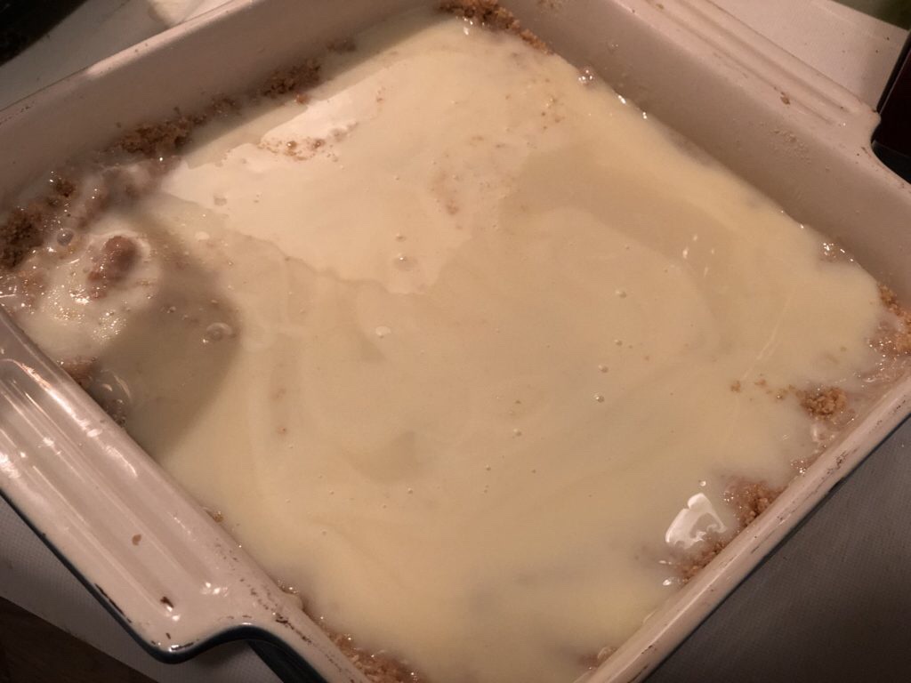 Once you have flattened the crumbs down, you pour a can of the Eagle condensed milk over the crumbs. You can carefully use a spatula to spread the milk evenly.